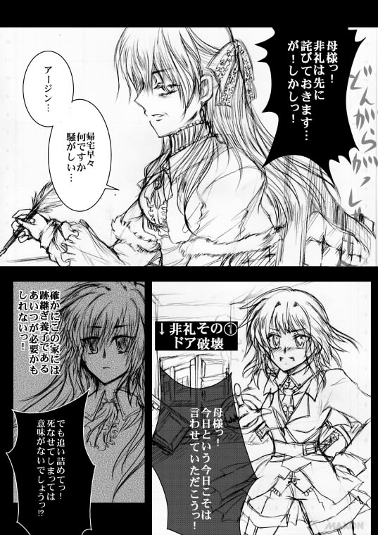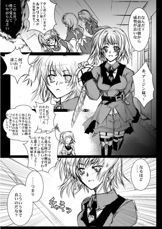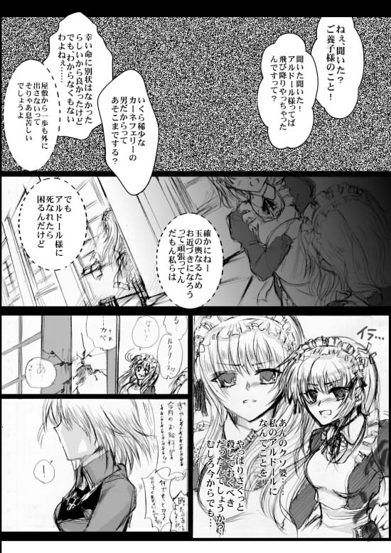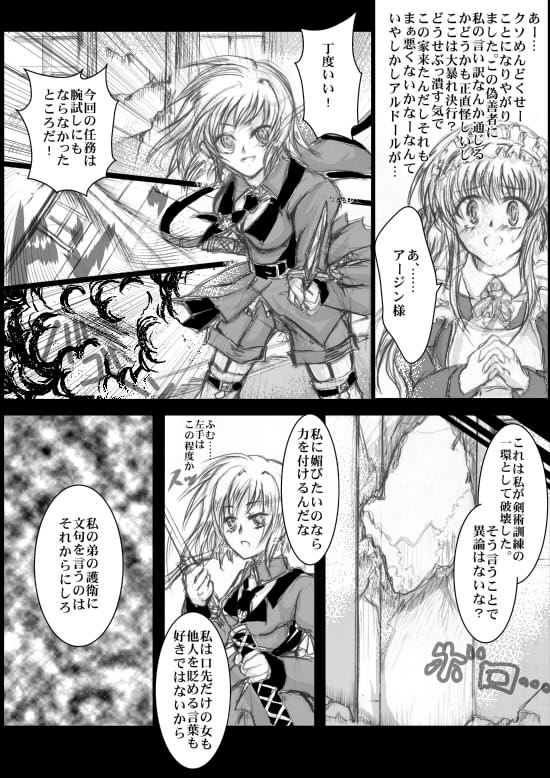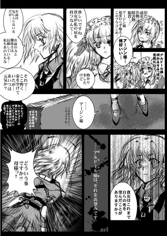 | ※アージン=トリオンフィ… 金髪緑目のカーネフェル人。アルドールの姉。シャトランジア貴族トリオンフィ家の第一子。養子のアルドールとは血の繋がりはない。女なので家は継げず、聖十字軍に入りシャトランジアの治安維持に努めている。何やらブラコンの気がある。 ※ルクリース 金髪青目のカーネフェル人。トリオンフィ家で働いているメイド。 世渡りは上手いが、強欲。金に目がない。 普通の仕事の他に、こっそりアルドールの監視、護衛を任されているお側付き。 |