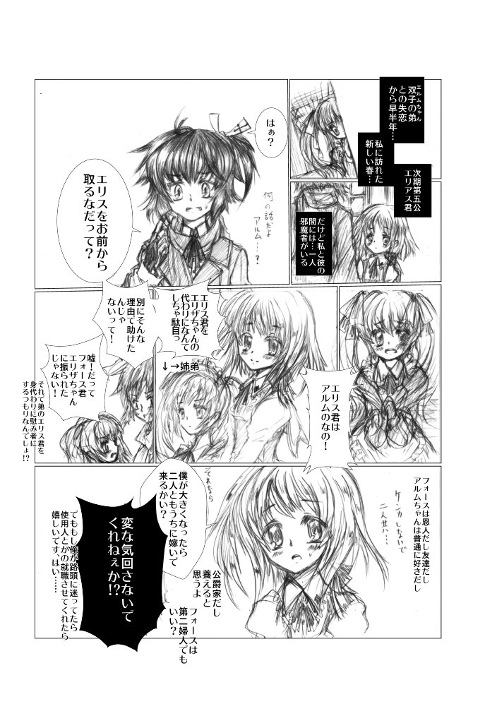 多分逆位置13章とか15章とかのどっか 落書き漫画 フォースVSアルム セネトレア次期第五公、公爵令息エリアス、通称エリス君。 ロリ近親相姦妊婦のアルムにそれでも好きだとか言っちゃうショタ。 絶世の美少年設定の所為で追っ手に掘られたり病気移されたり 散々な目に遭うけどまだ純真。 フォールとアルムとエルムと洛叉の罪を許し受け入れるための存在。 でも病気が発病して死期迫ってから死に脅え、世の中呪い始めるんだろう。 それがアルムの絶望に繋がると。 戻る