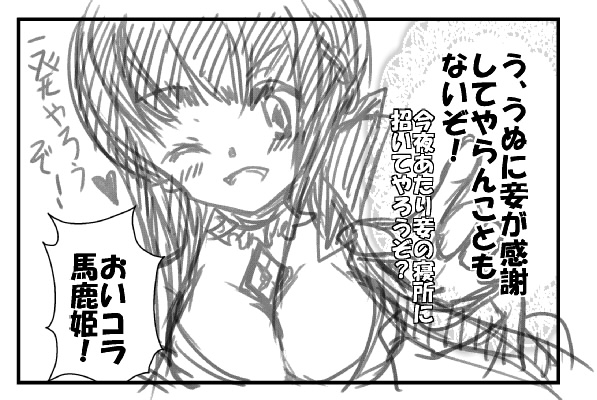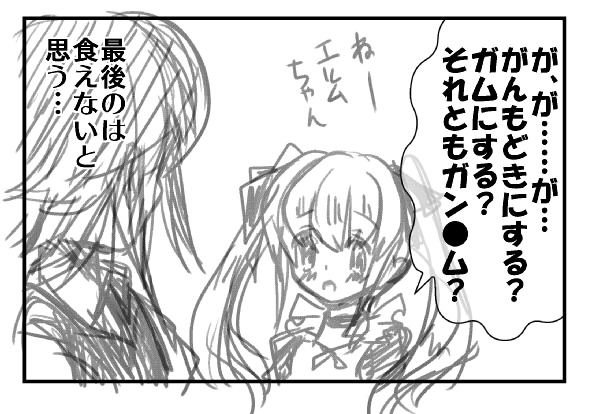 拍手お礼漫画その2。 花言葉の話。 ネタが思い浮かばなかったので落書き。 [03] エプロン姿で、「が」のつく手料理を振舞って エルム(ていうか姉さん、手にすら持ってねぇ) [05] 猫耳をつけて、「う」から始まる感謝の言葉をどうぞ ティルト(つぅかこの馬鹿姫、猫耳画面からはみ出て見えてねぇ) 戻る