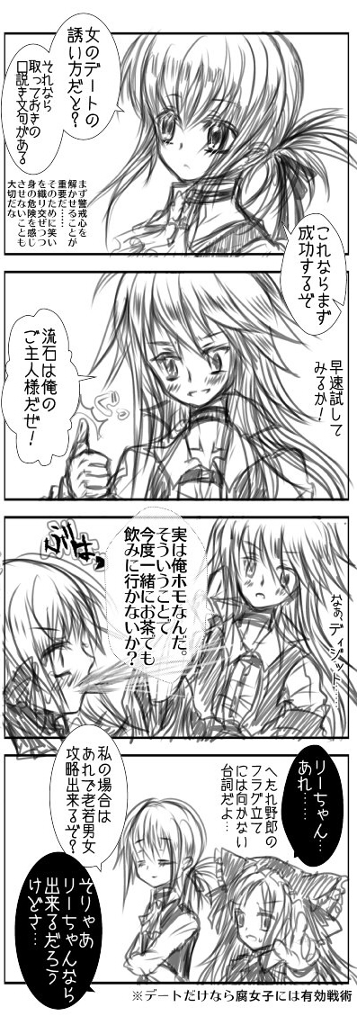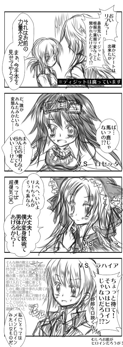 精神的苦痛を支払って、アスカはデートにこぎ着けた。 ただし、茶飲み友達以上には進展しない。 リフルの場合。 相手が女→それじゃあお姉さんが正道に 目覚めさせてあげるわうっふん展開。 相手が男→むしろ大歓GEY発展コース。