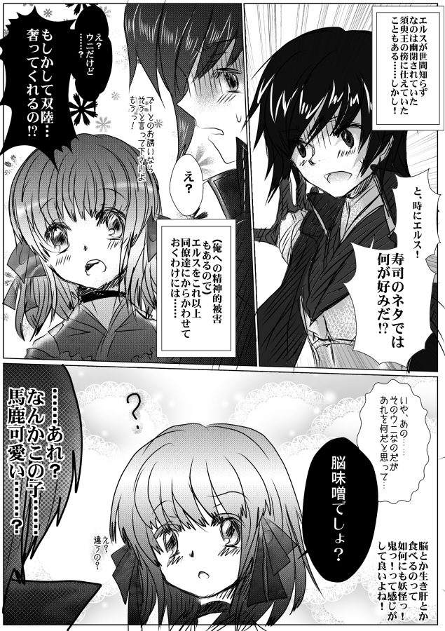 タロックの敵将達のらくがき漫画。 死んだレーヴェちゃんを描きたかっただけ。 レーヴェは食べさせてるウニが何かを 知っていてにやにやしてる。 エルスは山育ちだから海のことには疎いのよ。 まぁ、あれが脳味噌だと思ってたのは数年前までの私です。