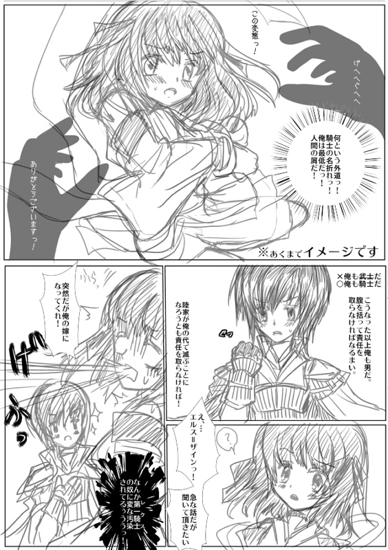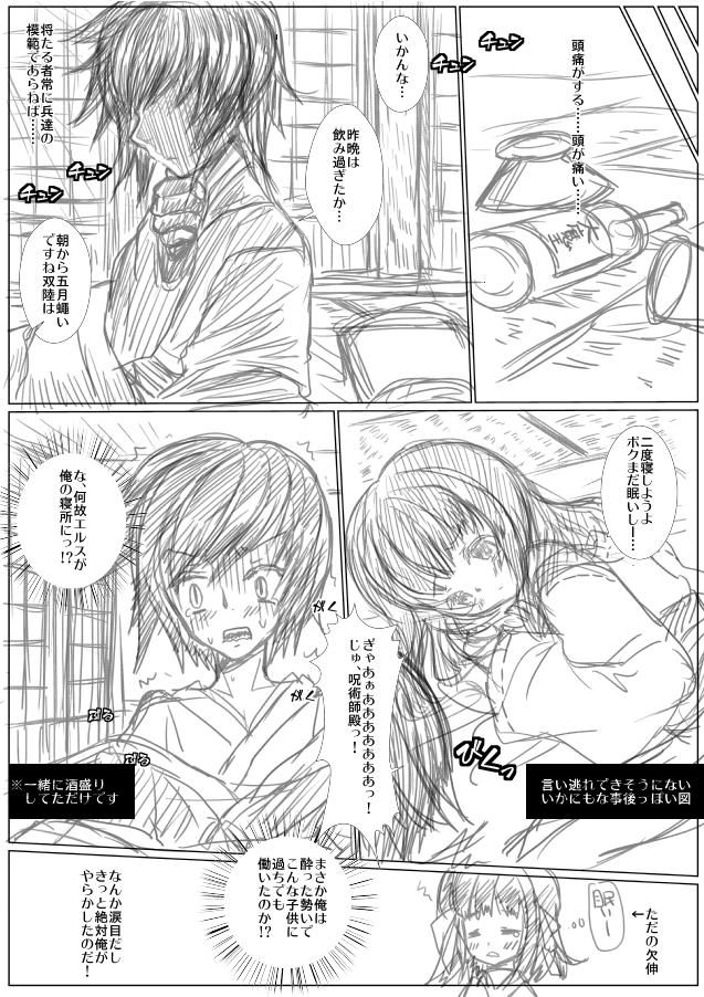 | エルス(あの変態衆道騎士から悪影響受けたのか?) 双陸 (ここは俺が責任を取らなければ) 双陸さんは真面目すぎて時に勘違い炸裂暴走するタイプ。 職場で相談できる相手もいないしね。 作者が夢でなんか朝チュンからはじまるこいつらの ラブストーリーを見てしまったのでネタに。 最近小説でもいちゃついてますね。青年とロリも良いけど青年とショタも良い。 敵ヒロインとしてはエルスはかなり好き。道化っぷりがツボ。 |